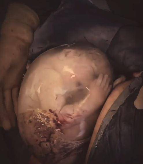 En la grabación también se observa el instante en el que el doctor corta la bolsa con la punta de una tijera quirúrgica. Enseguida, el bebé se estira, comienza a moverse y luego llora.