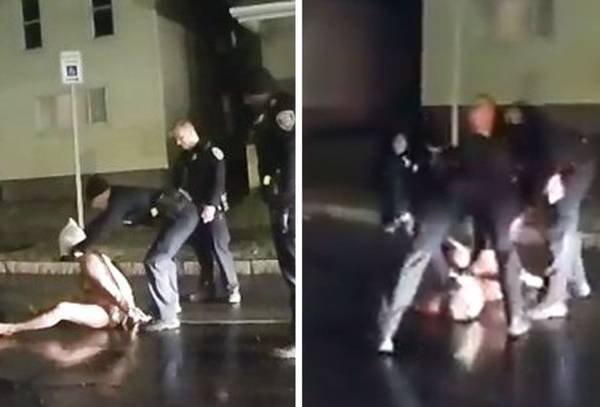 En los videos publicados en varios medios se ve a Prude, quien se ha desnudado, con las manos detrás de la espalda, esposado y gritando antes de que la policía le tapara la cabeza con una capucha, aparentemente para evitar que les escupiera, ya que había gritado que tenía coronavirus.