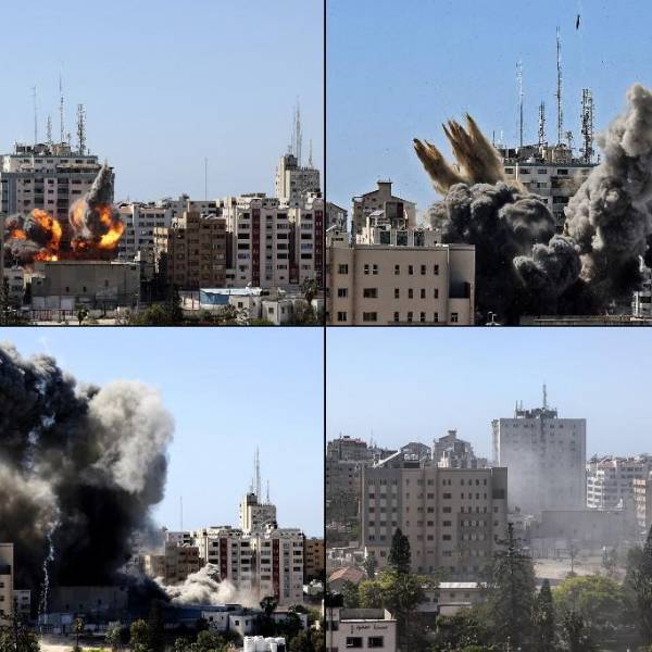 El edificio de 13 pisos atacado por la fuerza aérea israelí, que acababa de ser evacuado por los equipos de la cadena de información Al Jazeera y de la agencia de prensa estadounidense Associated Press (AP), se derrumbó, constataron periodistas de la AFP.