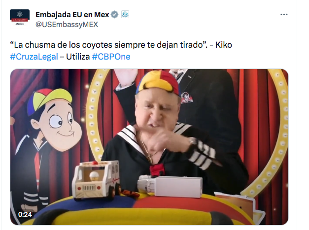 En el video publicado en redes sociales, "Kiko" también incentivó el cruce legal de migrantes a Estados Unidos y el uso de la aplicación de la Oficina de Aduanas y Protección Fronteriza CBP One, que agenda citas con autoridades migratorias a fin de impulsar el ingreso ordenado y seguro.