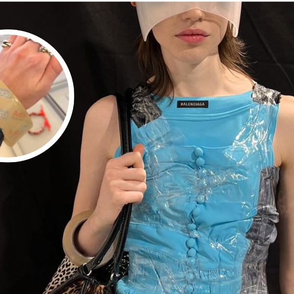 La colección otoño/invierno 2024-25 de Balenciaga incluyó esta inusual pieza. Una modelo desfiló luciendo la pulsera de cinta adhesiva junto a un vestido azul claro, enfatizando el contraste entre la pieza básica y lo glamoroso.