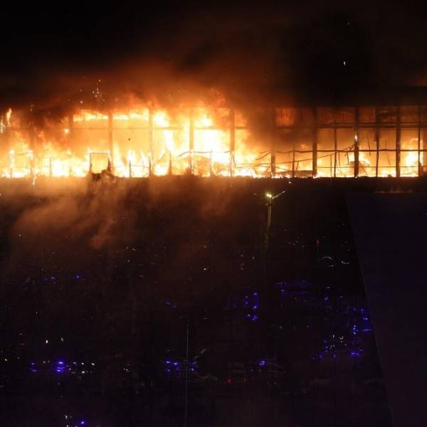 Según un reportero de la agencia rusa Ria Novosti, personas con uniformes de camuflaje irrumpieron en la sala y abrieron fuego antes de lanzar "una granada o una bomba incendiaria, provocando un incendio".