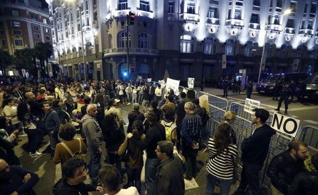 Los manifestantes portaron una pancarta con el lema "Ante el golpe de la mafia, democracia" y gritaron "Que no, que no, que no nos representan", "PSOE-PP, la misma mierda es", en referencia a los dos partidos mayoritarios de la Cámara Baja.