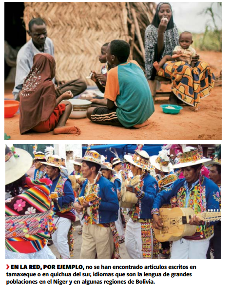 Después de analizar los 43 millones de artículos que conforman la Wikipedia, la enciclopedia virtual estableció que estos fueron escritos en 295 idiomas. Wikipedia, que hoy es la fuente de conocimiento más buscada en el planeta, permite a los autores escribir en el idioma que deseen. Por lo mismo, la gente que no encuentra su idioma en la Wikipedia recurre a otros idiomas fuera de la página para comunicarse. “Como consecuencia de esta exclusión en línea, se estima que hasta fines de este siglo, 4.500 lenguas dejarán de ser habladas y que apenas 200 se establecerán en Internet. De estas, siete tendrán mayor importancia”, sostiene la revista Veja: “Inglés, mandarín, español, portugués, ruso, francés y alemán”.