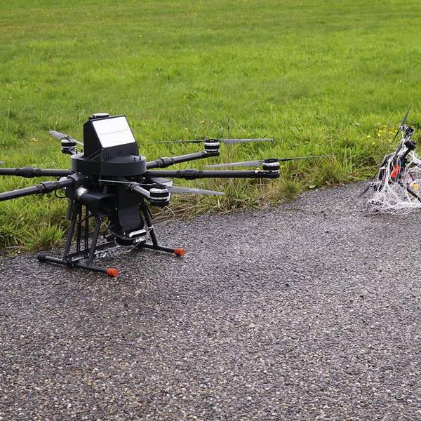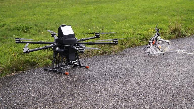 Otro dron, considerablemente más grande, arranca rápidamente desde la pista, teledirigido por un experto directo hacia la captura de su hermano pequeño: lo rodea, tantea el terreno, eleva la altitud, y dispara una red que inmoviliza sin grandes complicaciones al pequeño avión no tripulado. Lo traslada a la pista, y lo suelta, envuelto en hilos, con las alas atrapadas, hasta que un empleado de la base lo recoge y lo lleva para su análisis.