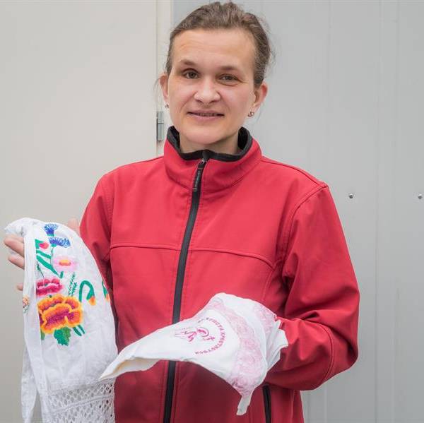 El marido de Nathala está en el frente. No pudo escapar con ella y con sus hijas a Leópolis pero ella lo lleva consigo. “Esta es la tela que nos regalaron 22 años atrás cuando nos casamos. Simboliza nuestra unión”, dice esta mujer de 43 años que también acertó en la huida a coger las toallas bordadas con las que envolvió a sus dos hijas al nacer.