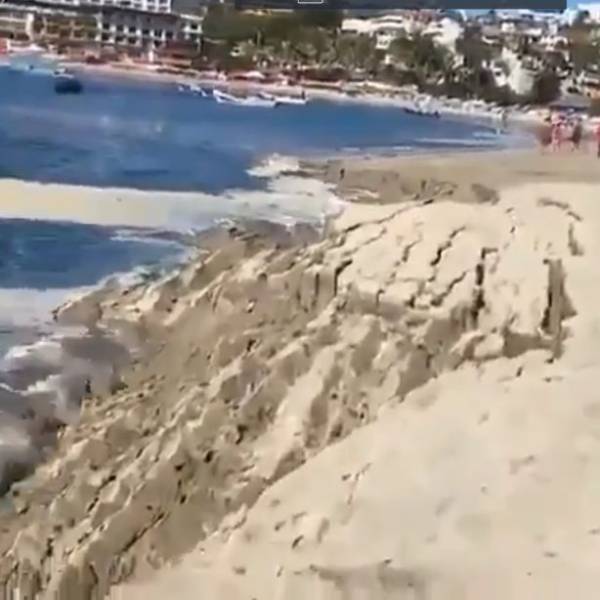 Turistas y visitantes de la playa Marinero en Puerto Escondido, en México, capturaron el momento en el mar desprendía gran parte del perfil de la costa y provocaba el derrumbamiento de un tramo considerable de la línea costera.
