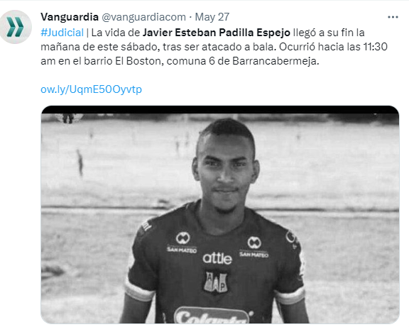 Bajo la modalidad de sicariato, el futbolista colombiano Javier Esteban Padilla, de 21 años de edad, fue asesinado a tiros en una peluquería de la ciudad colombiana de Barrancabermeja (noreste), informó la Policía del Magdalena Medio.
