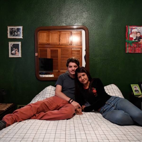 "Vivimos como casados", afirma risueña Oriana, de 21 años, en la habitación principal de paredes verdes, adornada con retratos familiares.