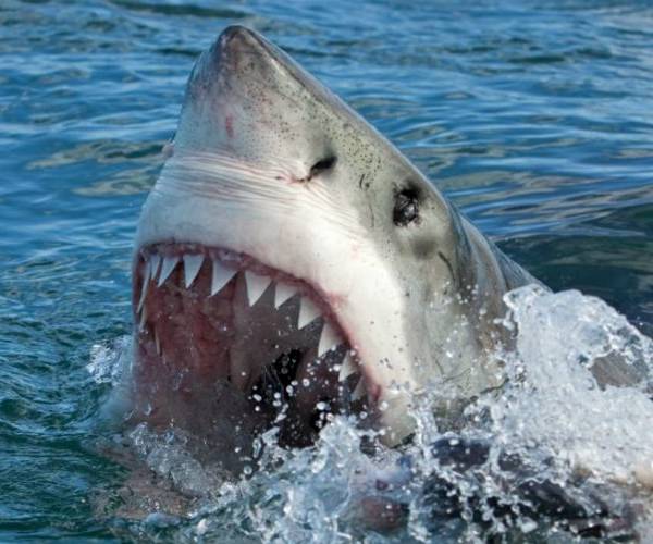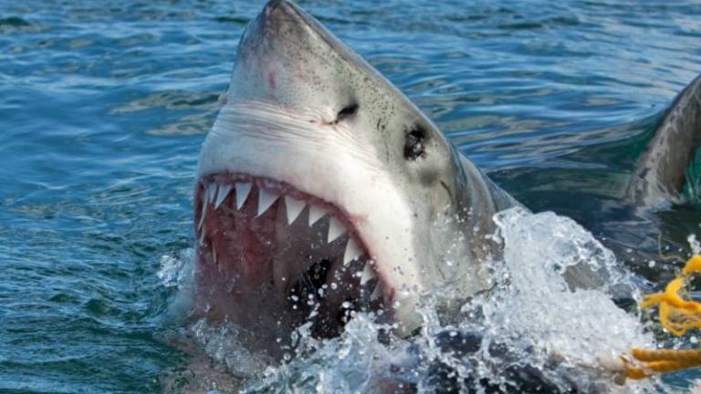 La grabación muestra cómo el depredador pasa por el frente de los visitantes con el pequeño tiburón en la boca.