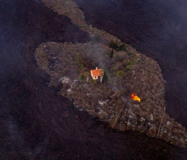Le llaman la "casa milagros", es la única propiedad cerca del volcán Cumbre Vieja en las Islas Canarias, España, que logró salvarse de la voraz lava que durante días ha arrastrado todo a su paso en La Palma, tras la erupción.
