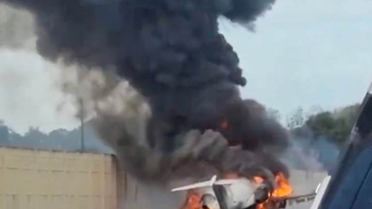 En imágenes difundidas por medios locales, se puede ver cómo el aparato en llamas emite una densa nube de humo negro desde un arcén de la autopista.