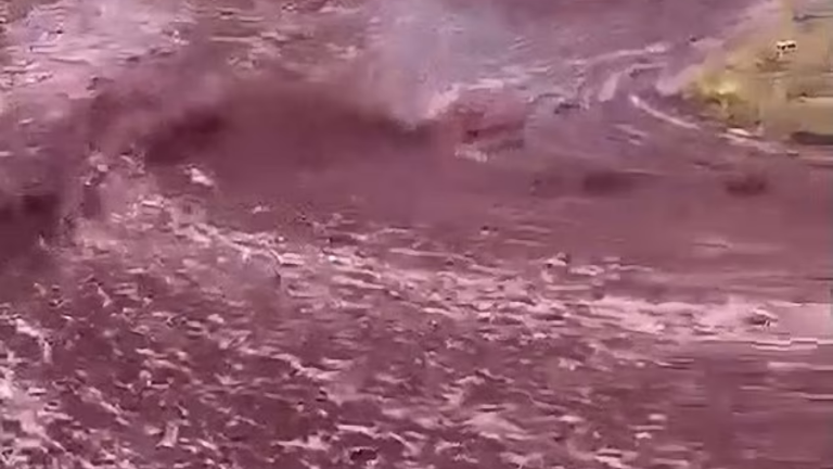A river of red wine flows through São Lourenco do Bairro in Portugal when the local distillery's 2.2 million liter tanks burst