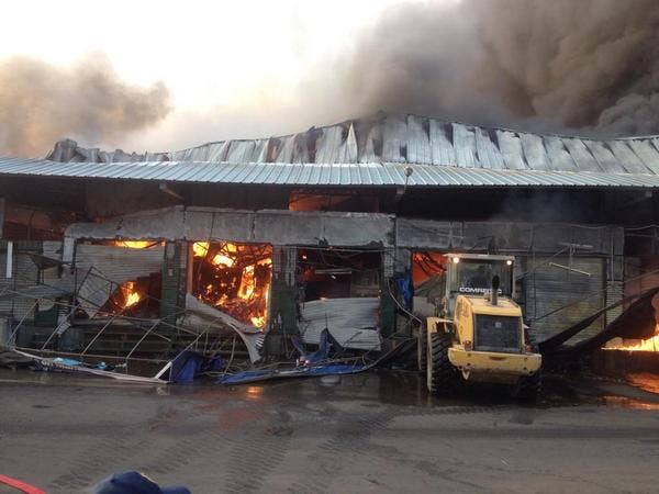 Maquinaria municipal y del Cuerpo de Bomberos continúan en la zona del desastre. Toneladas de víveres consumidos por las llamas y fierros retorcidos es lo que se observa como resultado del incendio.