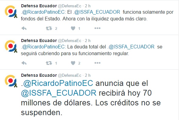 ministro de Defensa, Ricardo Patiño, quien en una entrevista con medios de comunicación aseguró que con esto se soluciona el problema de iliquidez temporal de la institución.