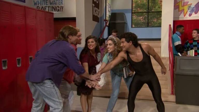 Con un escenario que replicó el pasillo de la secundaria "Bayside High", Mark Paul Gosselaar, Tiffani Thiessen, Mario López, Elizabeth Berkley, y Dennis Haskins, dieron vida una vez más a sus personajes Zack, Kelly, Jessie, Slater y el director Richard Belding. Los acompañó el propio Fallon, interpretando una joven versión de sí mismo.