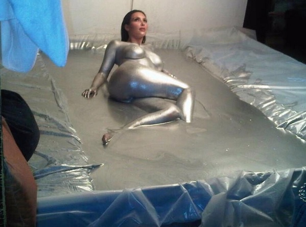 cubierta sólo por una capa de pintura plateada, en lo que parece ser una pileta de pintura.