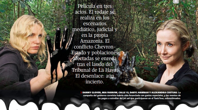 El brillo de Hollywood tras el lodo de la Mano Sucia Luces, cámara, acción. Durante su gobierno, Rafael Correa lanzó la campaña sobre la “Mano Sucia de Chevron”. La politización fue tóxica, pero Correa insistía en llevar su denuncia internacional “al más alto nivel”. No contento con pagar el ToxicTour de los actores Mia Farrow, Danny Glover y Daryl Hannah hasta el mismo rincón amazónico donde serían fotografiados exhibiendo la “Mano Sucia de Chevron”, buscaba más contundencia.