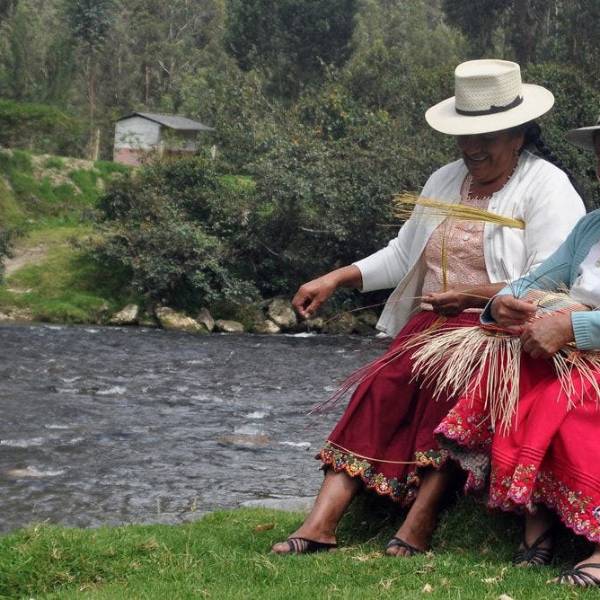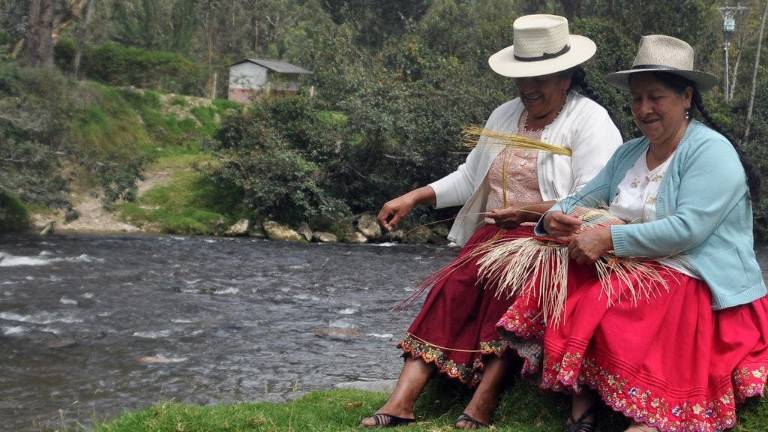 El sombrero de paja toquilla, las blusas bordadas a mano y las polleras de colores llamativos adornadas con bordados en hilo y lentejuelas son las principales características del atuendo de ellas.