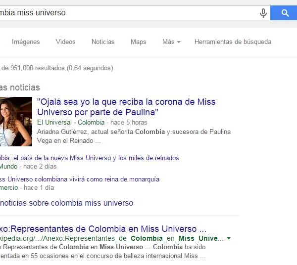 La coronación de la colombiana Paulina Vega como Miss Universo el pasado domingo disparó a nivel mundial las búsquedas en Internet en Google de noticias relacionadas con Colombia.