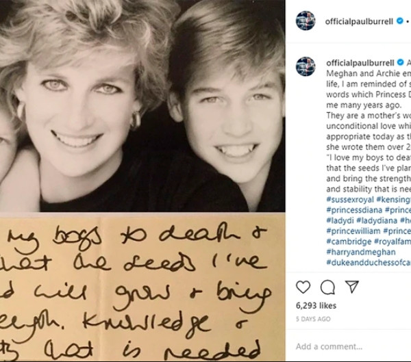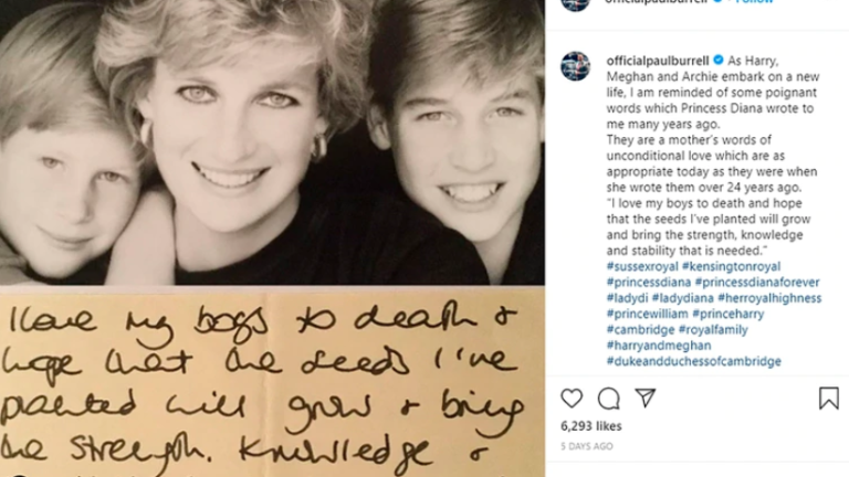 “Mientras Harry, Meghan y Archie se embarcan en una nueva vida, quiero recordar unas palabras conmovedoras que la princesa Diana me escribió hace muchos años. Son las palabras de amor incondicional de una madre que son tan apropiadas hoy como lo fueron cuando las escribió hace más de 24 años”, comienza explicando en su post Burrell.