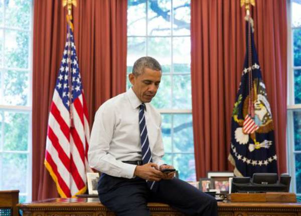 La Casa Blanca difundió una foto y un vídeo en el que se ve a un relajado Obama sentado en el Despacho Oval mandando su primer tuit con su teléfono.