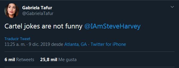 La representante de Colombia en el certamen Miss Universo 2019, Gabriela Tafur, se refirió en Twitter a la broma sobre los carteles que el conductor Steve Harvey hizo, en más de una ocasión, en el escenario donde se realizó el evento.