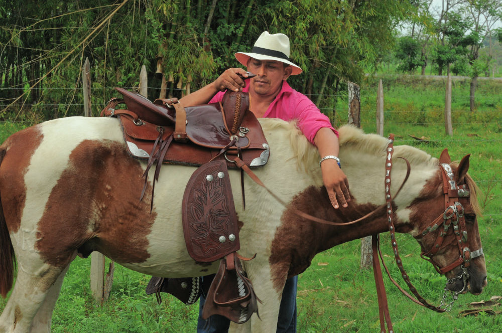 “Mientras más adornado esté mi caballo es mejor”, cuenta Quinto, quien coloca la montura y demás accesorios a su compañero de viaje luego de haberlo bañado. “Todo ese equipo pesa más de 60 libras”, añade el jinete.