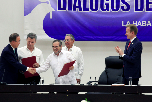 Colombia y las Fuerzas Armadas Revolucionarias de Colombia (FARC, marxistas), principal guerrilla colombiana, acordaron el jueves el alto al fuego bilateral tras medio siglo de conflicto armado, el desarme y la concentración de combatientes, además de convenir el mecanismo para refrendar el acuerdo final de paz.