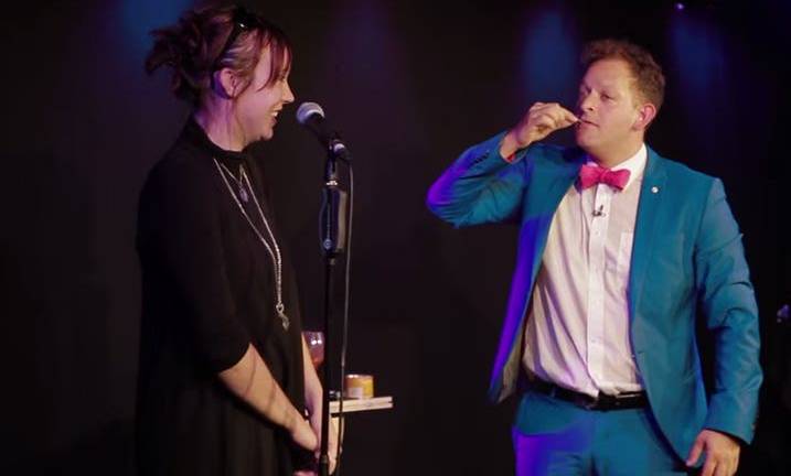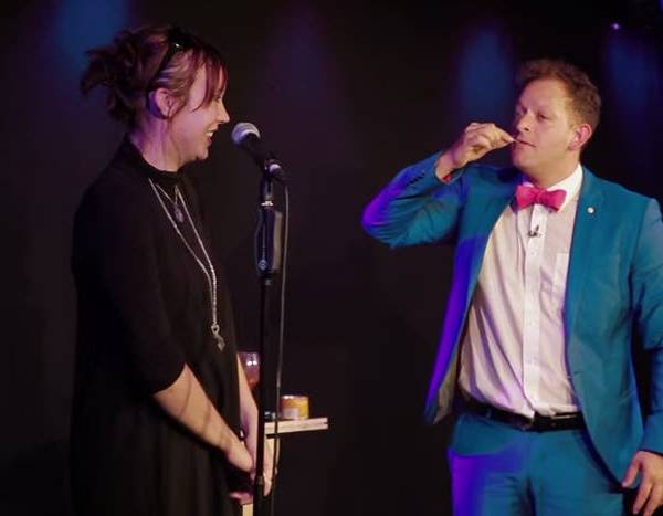 Luego pide a su novia que suba al escenario para ayudarlo y le pide que vaya leyendo en voz alta las letras que van saliendo de su boca, formando una frase.