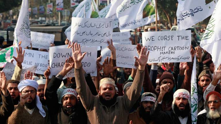 "Yo soy Mahoma" se podía leer en las pancartas de los manifestantes en la ciudad meridional de Karachi, en respuesta al lema "Yo soy Charlie" de apoyo a la revista francesa Charlie Hebdo que publicó las caricaturas consideradas "blasfemas" por los islamistas que sirvieron como detonante para el atentado que sufrió el pasado día 7, en el que murieron doce personas.