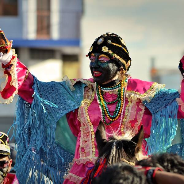 En general, las comparsas y vestimentas hablan de personajes encantados que se esconden detrás de un disfraz para agradecer milagros y atraer la buena fortuna, indicó Teleciudadana al apuntar que el personaje central de la celebración es la Mama Negra, que cierra el desfile.
