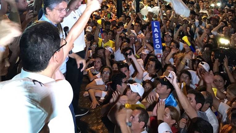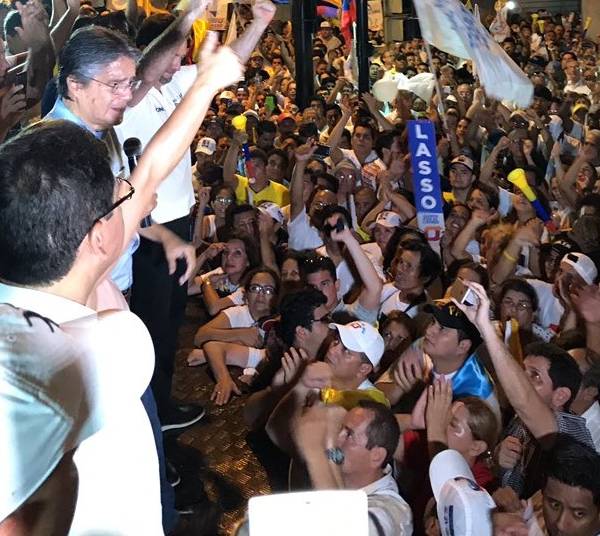Mientras tanto, miles de personas se mantienen en diferentes manifestaciones tanto en Quito como en Guayaquil. En Guayaquil, el candidato por el Movimiento CREO, Guillermo Lasso, lidera una manifestación en el centro de Guayaquil, al pie del Hemiciclo de la Rotonda.