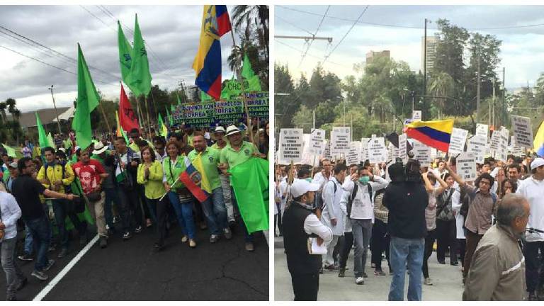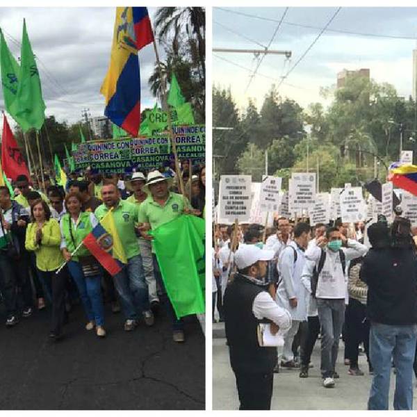 En contraste, la marcha opositora en la capital empezó afuera de la Caja del Seguro. Hasta las 20:20, los manifestantes, a los que se unieron profesionales médicos, que protestan en Quito, habían llegado a dos cuadras del Palacio de Carondelet.