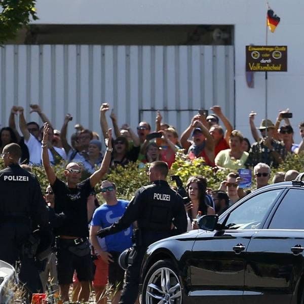 La canciller, saludó inmutable en dirección a los vecinos y entró a continuación en el centro sin hacer declaraciones pese a la importante presencia de medios de comunicación locales e internacionales, acompañada por el jefe del Gobierno del estado de Sajonia, el cristianodemócrata Stanislaw Tillich, y por el alcalde de Heidenau, el también conservador Jürgen Optiz.