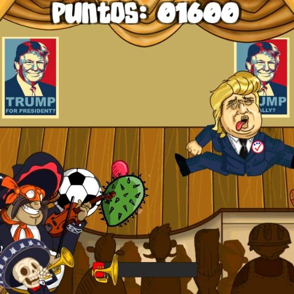 En "Trumpealo", el jugador puede arrojar zapatos y botellas, entre otros objetos, al precandidato republicano cuando dice alguno de sus controvertidos y recientes mensajes, entre ellos que muchos mexicanos que emigran a Estados Unidos son ladrones o violadores.