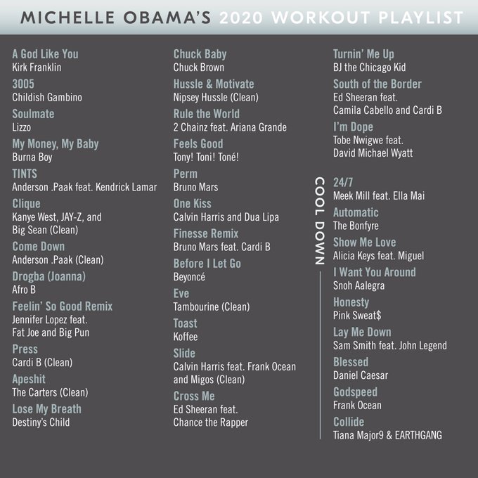 "Para ofrecer un poco de inspiración, quiero compartir mi lista de reproducción #WorkoutPlaylist con usted. Estas canciones siempre parecen darme un impulso extra para superar mis entrenamientos más difíciles. ¿Qué hay en tu lista de reproducción?", pregunta la exprimera dama, quien, según aseguró, escucha música al salir del gimnasio.