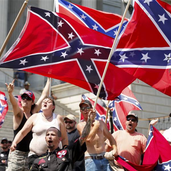 Los miembros del KKK ondearon la bandera de la batalla confederada mientras marchaban por las escaleras del edificio del Congreso, informó el diario The State.