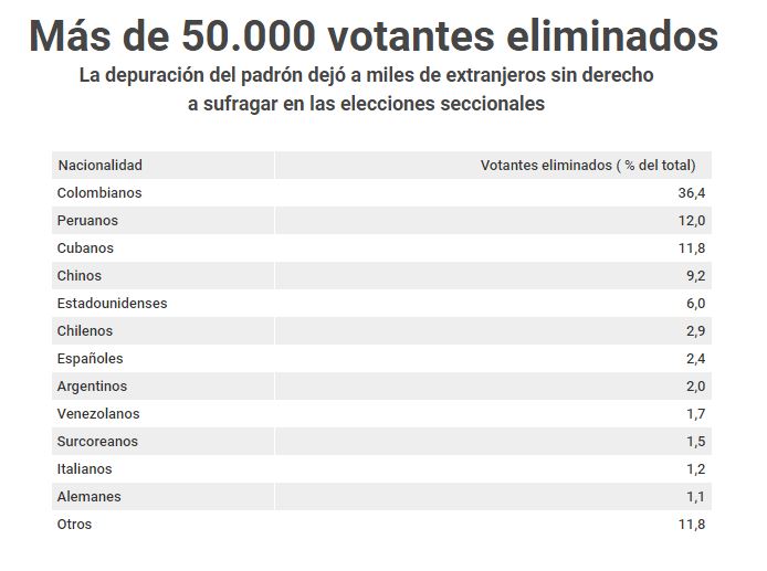 En octubre se anunció que se habían eliminado 50.023 registros de extranjeros residentes. Una fuente electoral dijo entonces que los excluidos eran quienes incumplían con el artículo 11 del Código de la Democracia. Se asumió que eran los que tenían menos de cinco años de residencia.