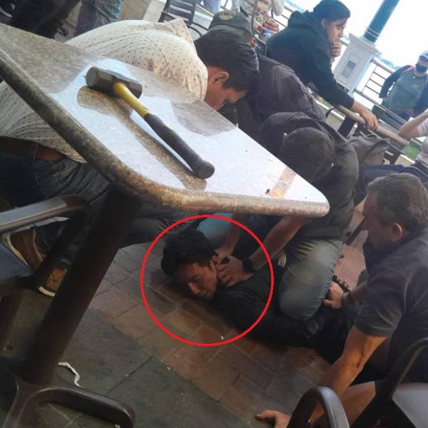 En un video que circula en redes sociales se observa al agresor en el piso, y el martillo utilizado sobre una mesa. Luego de aquello, uniformados de la Policía Nacional acudieron al sitio, para tomar procedimiento y llevarse detenido al hombre.