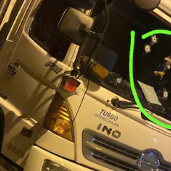 A través de redes sociales se difundieron imágenes que muestran al vehículo de trasporte pesado y los orificios de disparos que quedaron en el vidrio.