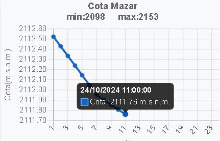 Al momento, según un informe estadístico con corte a las 10:00 de este jueves 24 de octubre, el embalse de Mazar se encontraba a 2.111,81 metros sobre el nivel del mar. Sin embargo, a las 11:00, la situación continuó deteriorándose, alcanzando 2.111,76 metros, lo que lo deja a solo un metro del mínimo crítico para no perder su control.