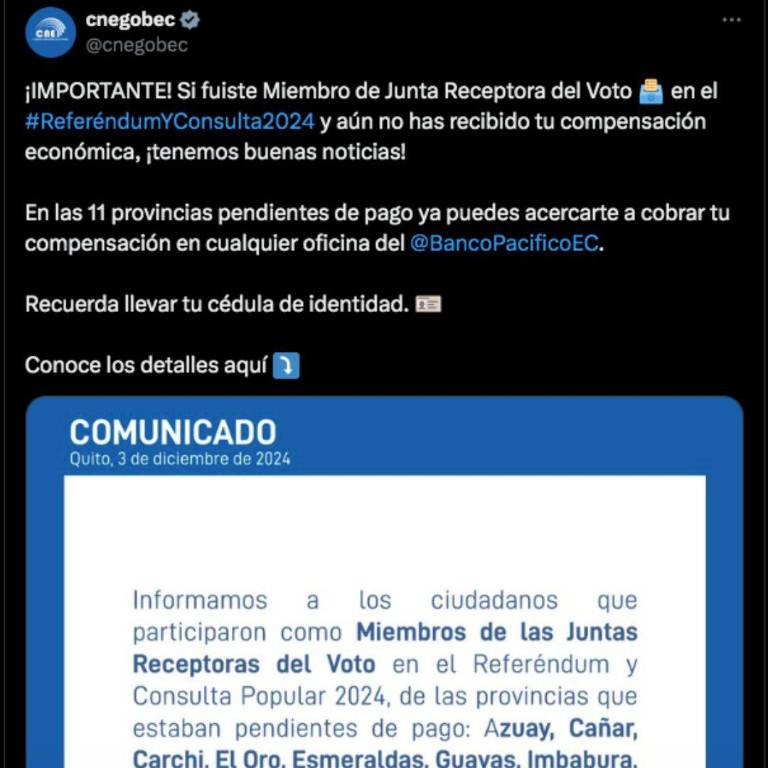 El Consejo Nacional Electoral (CNE) informó que los Miembros de las Juntas Receptoras del Voto, que participaron en el ‘Referéndum y Consulta Popular 2024’, ya pueden cobrar su remuneración económica.