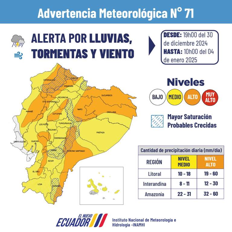 El Instituto Nacional de Meteorología e Hidrología (INAMHI) informó que, con base a sus previsiones, se registrarán lluvias de intensidad variable con tormentas en gran parte del país esta semana, sobre todo el 31 de diciembre y del 2 al 4 de enero.