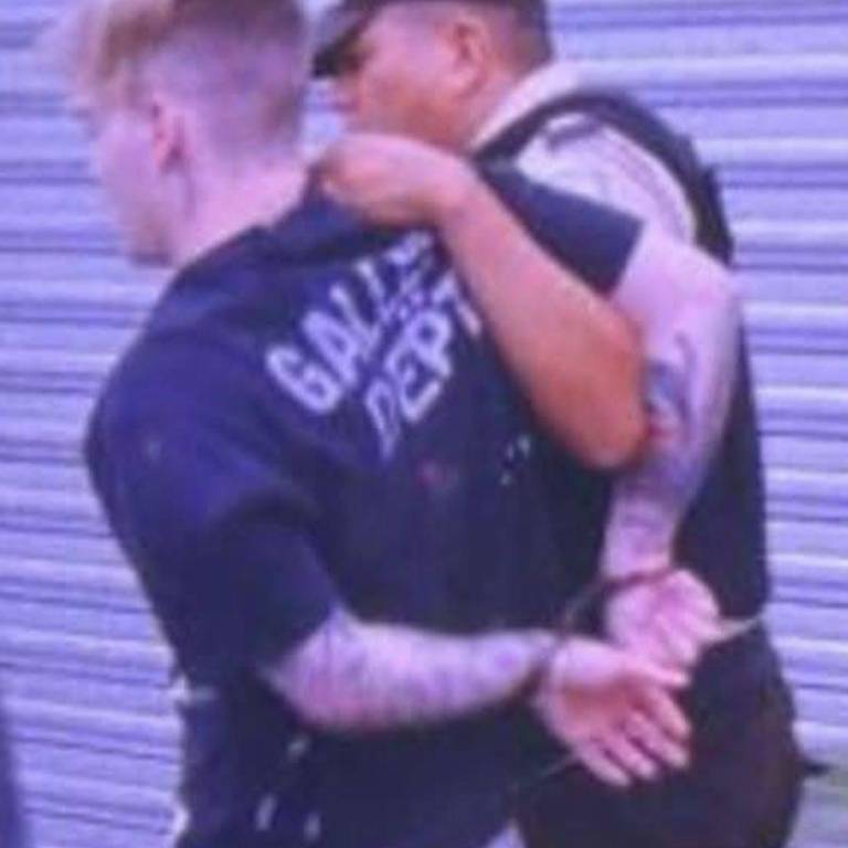 En redes sociales se viralizaron fotos y videos en los que se observa a Alejandro K., hijo de Mariam Sabaté, retenido por la Policía y sacado de aquella vivienda.