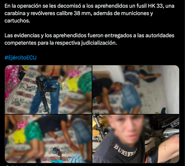 El Ejército Ecuatoriano informó que tras obtener información de inteligencia acudieron a una vivienda, donde individuos realizaron detonaciones de arma de fuego en contra de los uniformados.