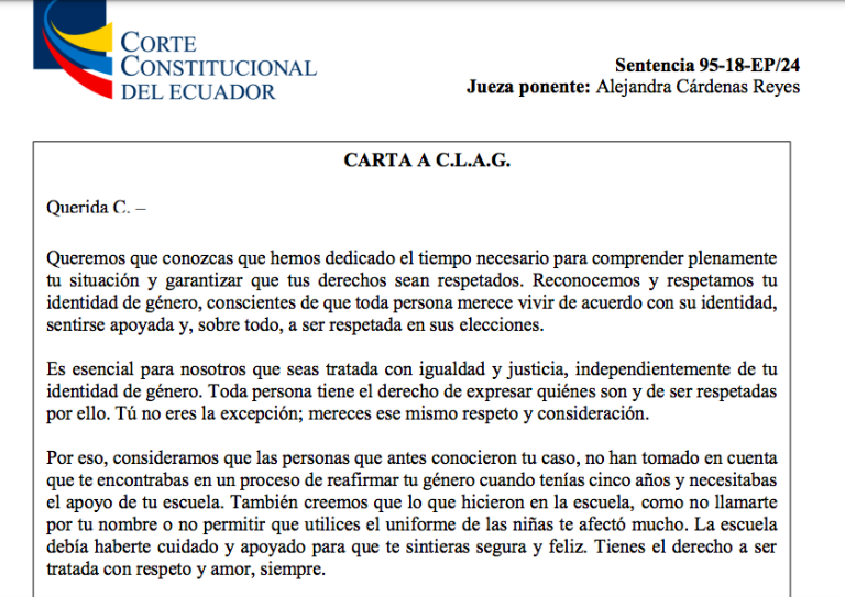 El caso se remonta al 2017, cuando la Defensoría del Pueblo, en representación de la madre y el padre de la niña C.L.A.G, presentó una acción de protección en contra de una Unidad Educativa y del Distrito de Educación por la omisión de dar acompañamiento a la niña en su proceso de transición de género, ya que la escuela insistió en tratarla como niño.