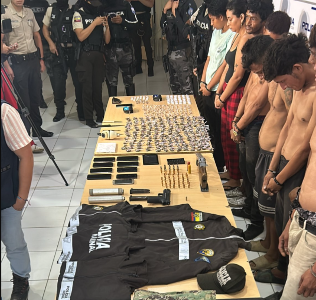 En esa intervención, se ejecutaron más de 36 allanamientos en Finca Delia, Guayas, logrando la aprehensión de seis personas, entre ellas un adolescente. Según las investigaciones, los detenidos estarían vinculados a delitos de extorsión, tráfico de sustancias ilícitas, tenencia de armas y la emisión de sellos y títulos de propiedad falsos.