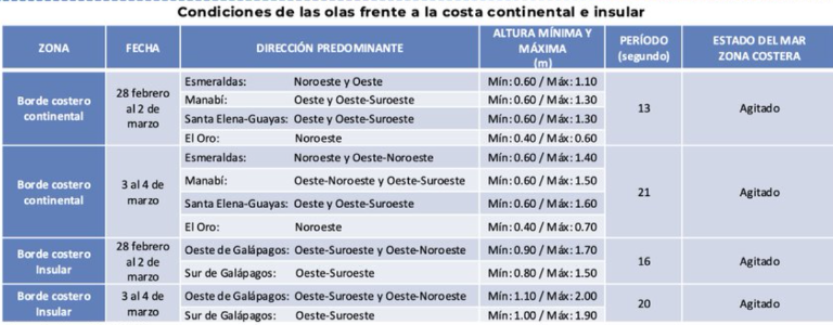 Según el reporte, entre el 27 de febrero y el 4 de marzo de 2025 se espera un mar agitado en la costa ecuatoriana, tanto en el territorio continental como en la región insular, debido al ingreso de oleaje proveniente del noroeste y suroeste del Pacífico.