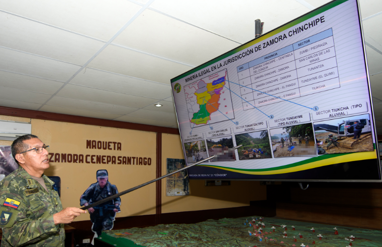 En ese centro de reuniones, el comandante de la Brigada explica a Vistazo la magnitud del desafío que enfrentan los militares. “La minería ilegal afecta el ecosistema, daña la biodiversidad en la ribera de ríos; ha causado cambios en los cauces, por eso hay inundaciones. Estas acciones ilegales perjudican a la población; en definitiva, dañan las economías, permiten que grupos delincuenciales ingresen en los sectores”.